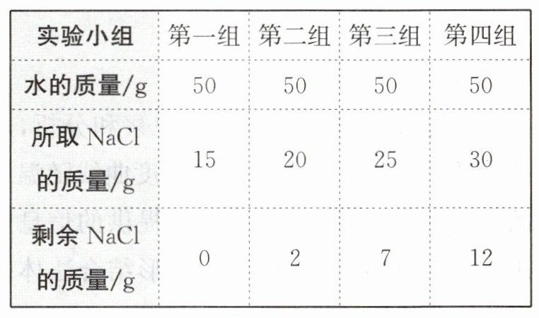 **例题** $ 20^{\circ}C $时,四个实验小组分别取不同质量的 $ NaCl $,逐渐加入各盛有 $ 50g $水的烧杯中,不断搅拌直到不再溶解为止,然后分别称量剩余 $ NaCl $的质量。记录数据如表所示。