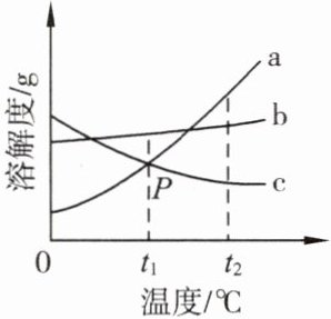 解析:a 的溶解度大于 b 的溶解度错误,因为没有指明温度,故 A 错误;$ P $ 点表示 $ t_{1}\degree C $ 时 a、c 两物质溶解度相等正确,因为 $ P $ 是交点,故 B 正确;将 $ t_{1}\degree C $ 饱和的 c 溶液升温到 $ t_{2}\degree C $,得到的是不饱和溶液错误,因为 c 的溶解度随温度的升高而减少,故 C 错误;将 $ t_{2}\degree C $ a、b、c 三种物质的饱和溶液降温到 $ t_{1}\degree C $,所得溶液中溶质质量分数由大到小的顺序为 $ b>a>c $,故 D 错误。