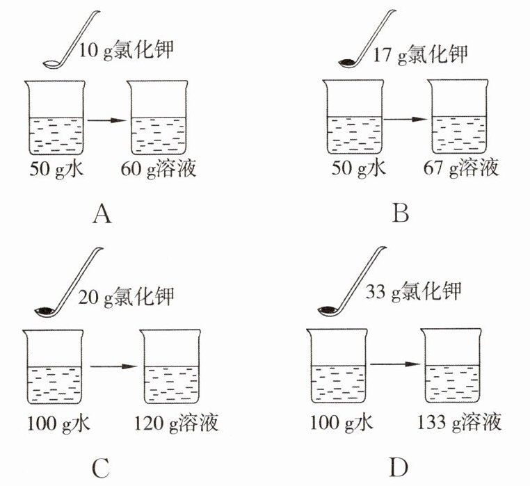 9. $20\ ^{\circ}C$ 时氯化钾的溶解度为 $34\ g$。下列是四位同学在 $20\ ^{\circ}C$ 时配制的氯化钾溶液,其中一定达到饱和的是(