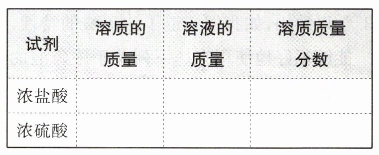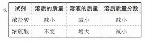 6. 一次实验后,老师忘记将浓盐酸和浓硫酸的瓶塞盖上,一周后才发现。这两瓶试剂露置于空气中(忽略水分的蒸发),有关溶液数据变化的结果是(填“增大”“减小”或“不变”):