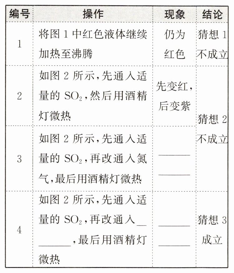 【问题与猜想】亚硫酸不稳定,为什么红色液体微热后不变为紫色?其原因可能为:猜想 1:加热不够充分;猜想 2:与空气中的氮气有关;猜想 3:与空气中的氧气有关。