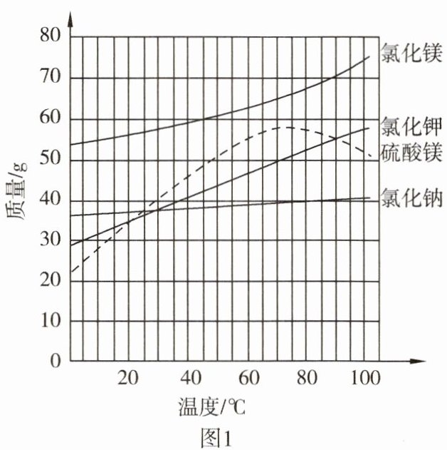 苦卤的主要成分是氯化镁和氯化钠,其次是硫酸镁和氯化钾。它们的溶解度曲线如图1所示。