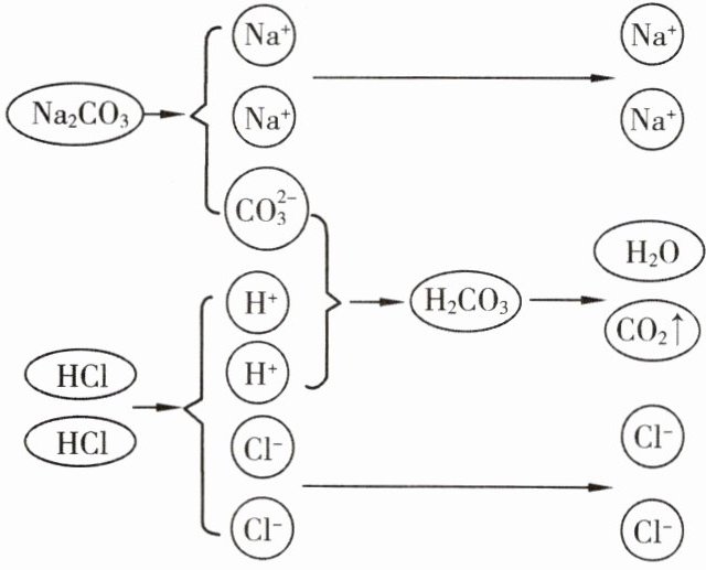 ① 如图是碳酸钠溶液和稀盐酸反应的微观示意图,请写出该反应的离子方程式:${2H⁺+CO₃²⁻=H₂O+CO₂↑}$。