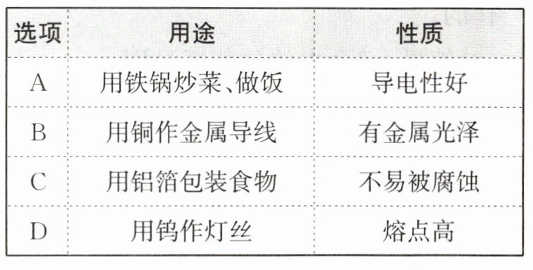 9. 不同的金属有许多共同的物理性质,也有各自的特性。下列金属中,其物理性质和用途均正确且相互匹配的是(