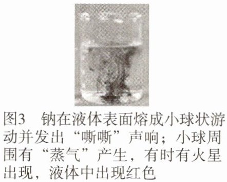 图3 钠在液体表面熔成小球状游动并发出“嘶嘶”声响;小球周围有“蒸气”产生,有时有火星出现,液体中出现红色