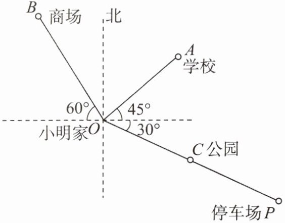(2)学校在小明家北偏东45°方向,商场在小明家北偏西30°方向,公园在小明家南偏东60°方向,停车场在小明家南偏东60°方向;公园和停车场的方位相同。