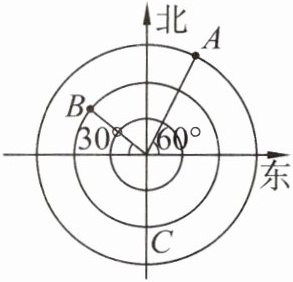 8. 小明乘坐一艘游船出海游玩,游船上的雷达扫描探测得到的结果如图所示,每相邻两个圆之间的距离是 $1km$(小圆半径是 $1km$)。若小艇 $C$ 在游船的正南方向 $2km$ 处,则下列关于小艇 $A$,$B$ 的位置描述正确的是(