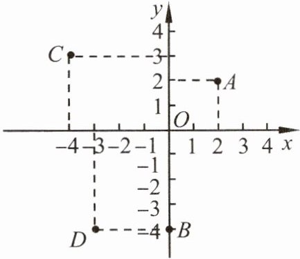 例1 如图,写出平面直角坐标系中点$A$,$B$,$C$,$D$的坐标,并分别指出它们所在的象限。