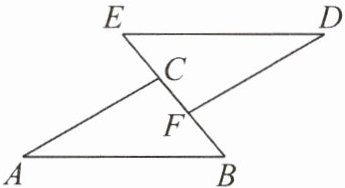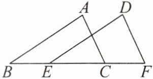 【点拨】根据三角形的内角和等于$180^{\circ}可求出\angle ACB$的度数,然后根据全等三角形的对应角相等即可求出$\angle DFE$的度数。由全等三角形对应边相等可得$EF = BC$,然后推出$EC = BF$。