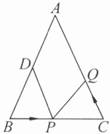 10. 如图,在$\triangle ABC$中,$AB = AC = 10\mathrm{cm}$,$BC = 8\mathrm{cm}$,点$D为AB$的中点,点$P在线段BC上以3\mathrm{cm/s}的速度由点B向点C$移动,同时点$Q在线段CA上由点C向点A$移动。若点$Q的移动速度与点P$的移动速度相同,则使$\triangle BPD \cong \triangle CQP$需经过多长时间?