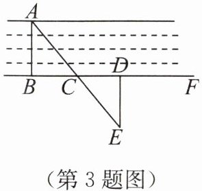 3. 如图,要测量河两岸相对两点 $ A $,$ B $ 间的距离,可先在 $ AB $ 的垂线上取 $ C $,$ D $ 两点,使 $ BC = CD $,再作出 $ BD $ 的垂线 $ DE $,使 $ E $ 与 $ A $,$ C $ 在一条直线上,则 $ DE $ 的长就是 $ AB $ 的长(即测得河宽)。这个结论可由 $ \triangle EDC \cong \triangle ABC $ 得到,判定这两个三角形全等的依据是(