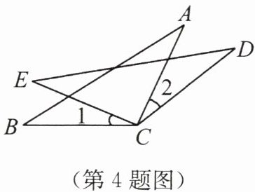 4. 如图,已知 $ BC = EC $,$ \angle 1 = \angle 2 $。要使 $ \triangle ABC \cong \triangle DEC $,应添加的一个条件为
