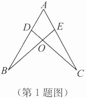 1. 如图,点 $ D $,$ E $ 分别在线段 $ AB $,$ AC $ 上,$ CD $ 与 $ BE $ 相交于 $ O $ 点。已知 $ AB = AC $,则不能判定 $ \triangle ABE \cong \triangle ACD $ 的一个条件是(