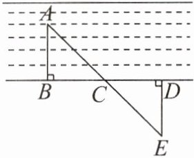 例 1 泰勒斯是古希腊科学家,相传他利用三角形全等的方法求出岸上一点到海中一艘船的距离。如图,B 是观察点,船 A 在 B 的正前方,过点 B 作 AB 的垂线,在垂线上截取线段 BD,点 C 是 BD 的中点。观察者从点 D 沿垂直于 BD 的 DE 方向走,直到点 E、船 A 和点 C 在一条直线上,则 D,E 间的距离即为船离岸的距离 AB。请根据图形写出这样做的合理性。