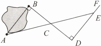 方法二:如图,在 AB 的垂线上取 C,D 两点,使 BC = CD;过点 D 作 BD 的垂线 DF,在 DF 上找一点 E,使 A,C,E 三点在一条直线上,则 DE 的长度就是 AB 的长度。