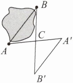【解】方法一:如图,在池塘外找一点 C,使 C 点能直接到达 A,B 两点。连接 AC 并延长 AC 到 A',使 A'C = AC,连接 BC 并延长 BC 到 B',使 B'C = BC,则 A',B'之间的距离 A'B'就是 A,B 之间的距离。