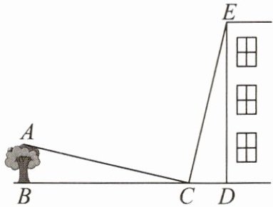 8. 某建筑测量队为了测量一栋垂直于地面的居民楼 ED 的高度,在大树 AB 与居民楼 ED 之间的地面上选了一点 C,使 B,C,D 在一条直线上,测得垂直于地面的大树顶端 A 的视线 AC 与居民楼顶 E 的视线 EC 的夹角∠ACE = 90°。若 AB = CD = 7 m,BD = 32 m,请计算出该居民楼 ED 的高度。