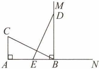 12. 如图,CA ⊥ AN,垂足为点 A,AB = 8 cm,AC = 4 cm,射线 BM ⊥ AN,垂足为点 B。动点 E 从 A 点出发以 2 cm/s 的速度沿射线 AN 运动,点 D 为射线 BM 上的一个动点,随着 E 点的运动而运动,且始终保持 ED = CB。当点 E 离开点 A 后(E 不在 A 点上),运动