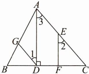 如图,已知 $AD\perp BC$ 于点 $D$,点 $E$ 在 $AC$ 上,点 $G$ 在 $AB$ 上,$\angle 2 + \angle C = 90^{\circ}$,$\angle 1 = \angle 2$,求证:$GD// AC$。