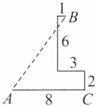 9. 假期中,小明和同伴到某海岛参加“探宝”游戏。按照如图所示的“探宝图”,他们从$A点登陆后先往东走8km$,又往北走$2km$,遇到障碍后又往西走了$3km$,再折向北走到$6km$处往东一拐,仅走了$1km$就找到了“宝藏”。问登陆点$A$到“宝藏”埋藏点$B$的直线距离是多少千米?
