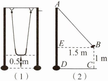 7. 如图是一副秋千架,图(1)是从正面看,当秋千绳子自然下垂时,踏板离地面$0.5m$(踏板厚度忽略不计);图(2)是从侧面看,当秋千踏板荡起至点$B$位置时,点$B离地面的垂直高度BC为1m$,离秋千支柱$AD的水平距离BE为1.5m$(不考虑支柱的直径)。求秋千支柱$AD$的高。