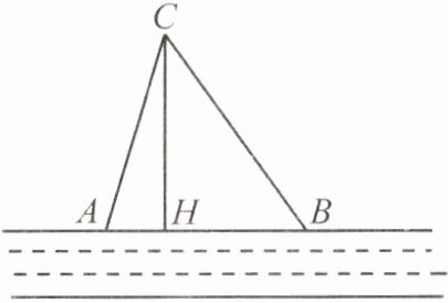 16. (14 分)如图,在一条东西走向的河的一侧有一个村庄 $ C $,河边原有两个取水点 $ A $,$ B $,其中 $ AB = AC $。由于某种原因,由 $ C $ 到 $ A $ 的路现在已经不通。为方便村民取水,决定在河边新建一个取水点 $ H $($ A $,$ H $,$ B $ 在一条直线上),并新修一条路 $ CH $,测得 $ CB = 3 km $,$ CH = 2.4 km $,$ BH = 1.8 km $。