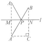 解:如图,延长$AM$到点$A'$,使$MA'=MA$,连接$A'B$交$l$于点$P$,过$A'$作$A'C\perp BN$,交$BN$的延长线于点$C$。