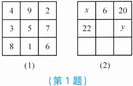 1. 幻方是古老的数学问题,我国古代的《洛书》中记载了最早的幻方——九宫格. 将 9 个数填入幻方的空格中,要求每一横行、每一竖列以及两条对角线上的 3 个数之和相等,例如图(1)就是一个幻方,图(2)是一个未完成的幻方,则 $x$ 与 $y$ 的和是(