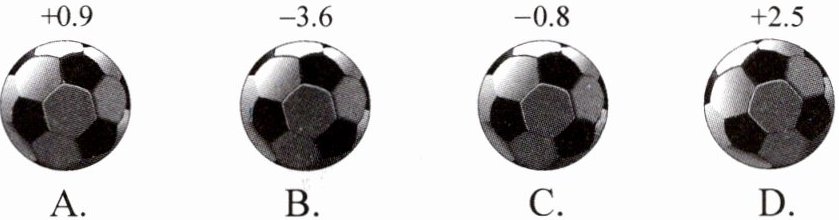 3. 如图所示,检测 4 个足球,其中超过标准质量的克数记为正数,不足标准质量的克数记为负数,从轻重的角度看,最接近标准的是(