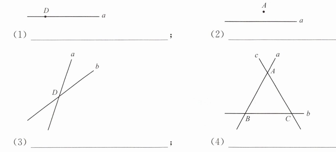 (1)点D在直线a上(或直线a经过点D) (2)点A在直线a外 (3)直线a,b相交于点D (4)三条直线a,b,c两两相交于点A,B,C