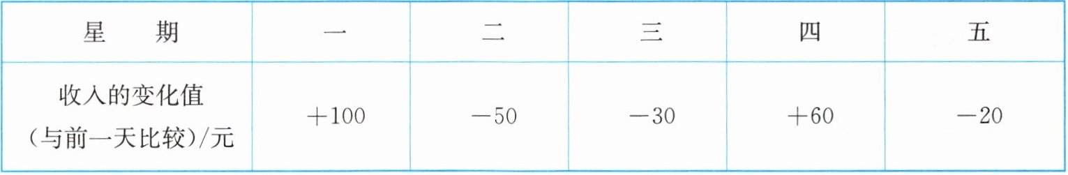 9. 某校门口有一家小文具店,上周的星期日收入$200$元,下表是本周星期一至星期五小店的收入变化情况(收入比前一天多为正,收入比前一天少为负)。