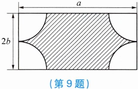 9. 下图是某居民小区的一块长为 $ a m $、宽为 $ 2b m $ 的长方形空地,为了美化环境,准备在这个长方形的四个顶点处修建一个半径为 $ b m $ 的扇形花台,然后在花台内种花,其余种草。如果建造花台及种花的费用为 $ 100 $ 元/$ m^{2} $,种草的费用为 $ 50 $ 元/$ m^{2} $。