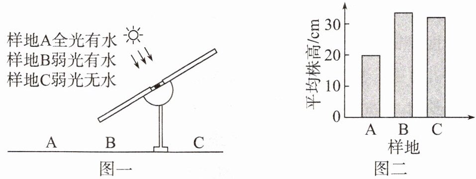 12. 太阳能是一种清洁可再生能源,开发应用前景广泛。为研究某草原架设太阳能光伏电板对草原常见牧草——羊草生长的影响,研究者选择图一所示A、B、C三个具有代表性的采样区域(称为“样地”),测定样地内羊草的株高,得到图二所示结果。