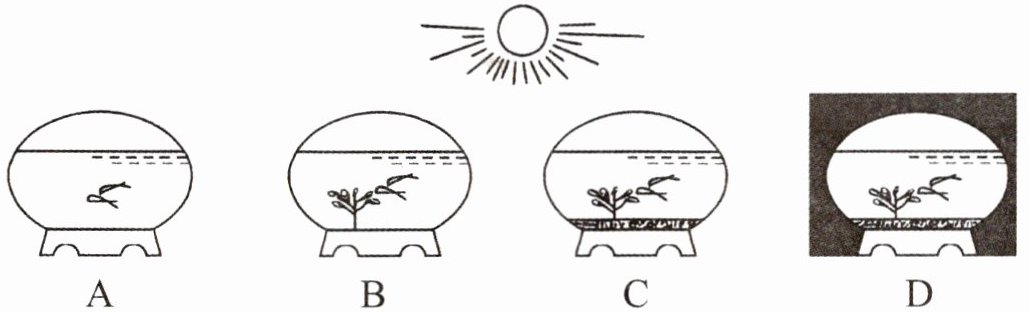 第四步:把A、B、C瓶置于阳光下,D瓶放在黑暗的环境中。实验装置如下图所示。