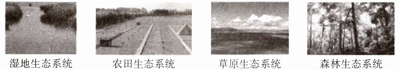 6. 党的二十大报告指出,“推动绿色发展,促进人与自然和谐共生”“提升生态系统多样性、稳定性、持续性”,体现出我国从单一的污染治理和生态建设向山水林田湖草沙一体化保护和系统治理的转变。我国有着多种多样的生态系统。下面是我国几种生态系统的示意图,据图回答下列问题: