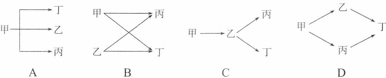 1. 下列为4种生物在A、B、C、D生态系统中构成的食物网模式图,最稳定的生态系统是(