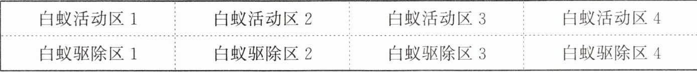 为了更好地理解白蚁在生态系统中的作用,研究人员连续多年在旱季的热带雨林中进行实验,分别探究了干旱期间“白蚁的活动对植物幼苗存活率的影响”“白蚁的活动对土壤含水量的影响”“白蚁的活动对土壤营养成分的影响”。在2500平方米的热带雨林中,随机选取八个区域,在其中的四个区域设置毒饵,以便将白蚁驱除,另外四个区域未采取任何措施。