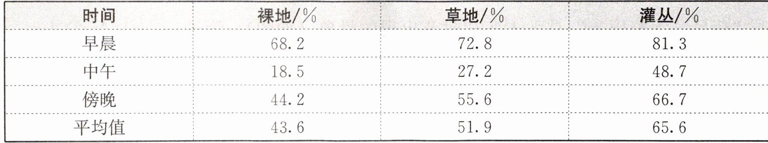 (3)制订并实施计划:用干湿球湿度计在同一天的早晨、中午、傍晚三个时间段分别测量裸地、草地和灌丛的空气湿度(每次测量 10 分钟),每地测三个时间段,取平均值记录在表格中。