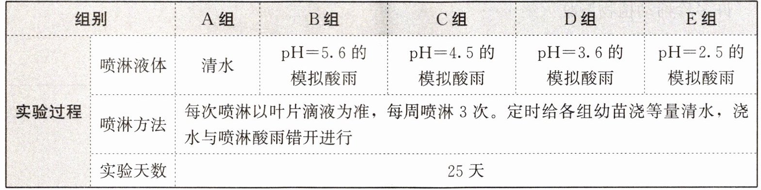 │ 喷淋液体 │ 清水 │ pH=5.6 的模拟酸雨 │ pH=4.5 的模拟酸雨 │ pH=3.6 的模拟酸雨 │ pH=2.5 的模拟酸雨 │