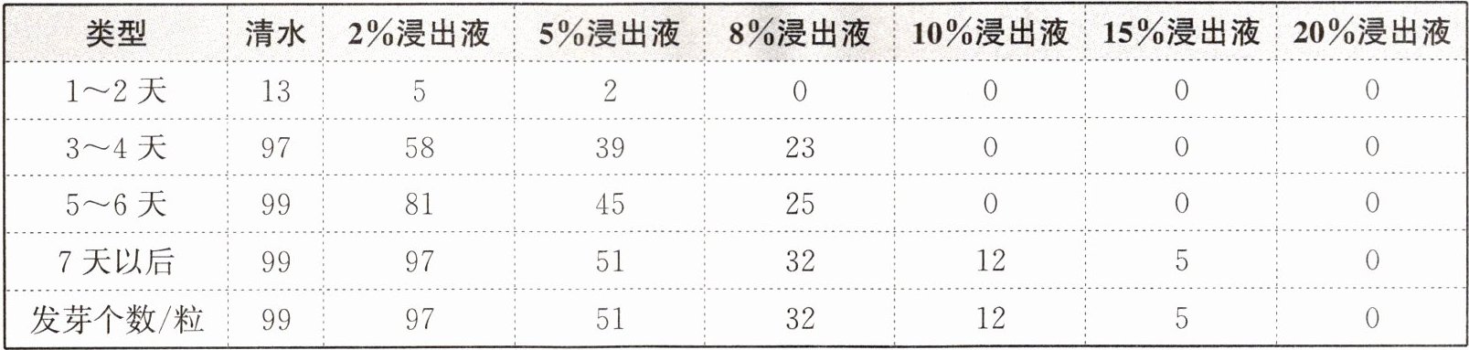 (3) 根据表中数据,兴趣小组得出结论:随着废旧电池浸出液浓度的增加,水稻种子发芽个数