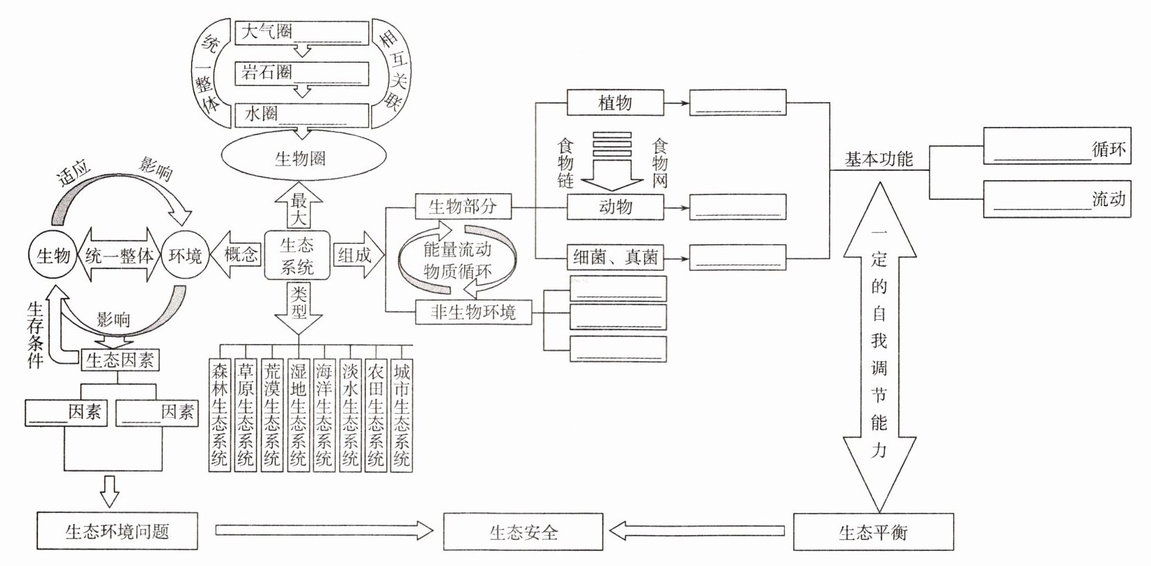 综上,从左到右,从上到下依次填入:生物;非生物;生产者;消费者;分解者;阳光;空气;水;土壤;物质;能量。