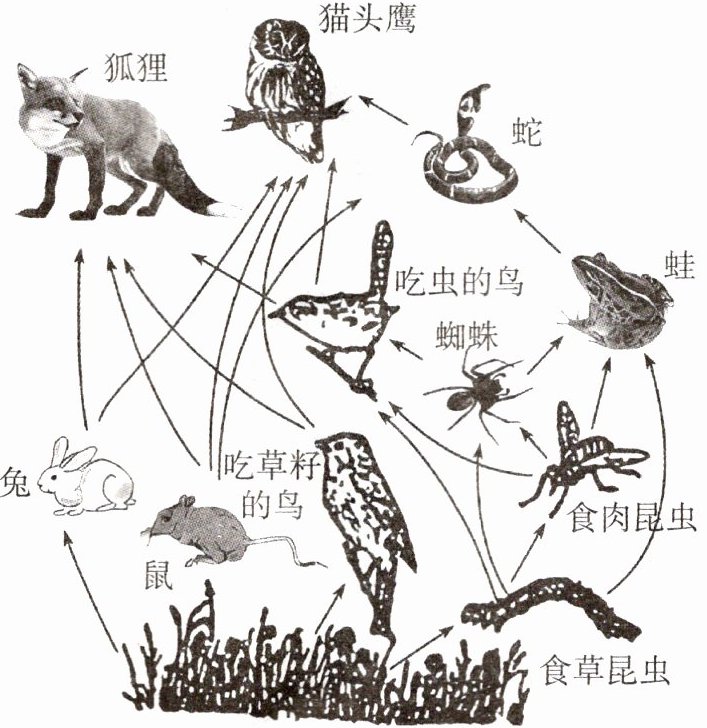草→食草昆虫→食肉昆虫→蜘蛛→蛙→蛇→猫头鹰