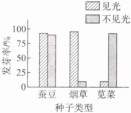 5. 研究人员在见光和不见光条件下测定了蚕豆、烟草和苋菜的种子发芽率,结果如右图,下列判断错误的是(