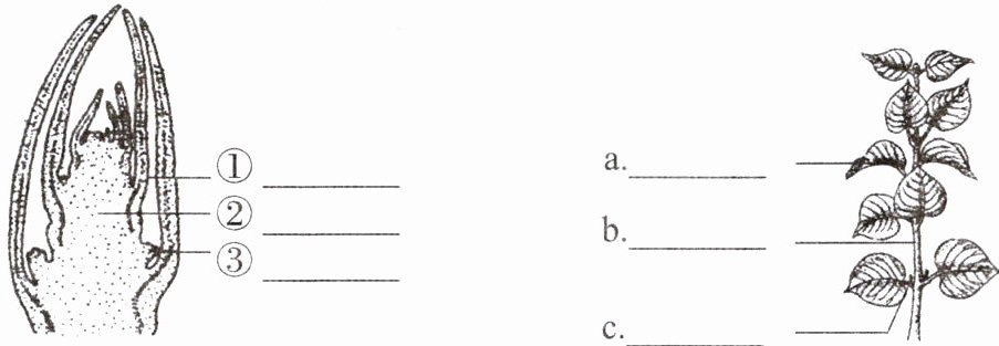 1. 枝条都是由芽发育成的,这样的芽称为叶芽。叶芽的结构包括______、______和______。芽中有______组织,叶芽在发育时,______组织的细胞分裂和分化,形成新的枝条。枝条由______、______和______构成。