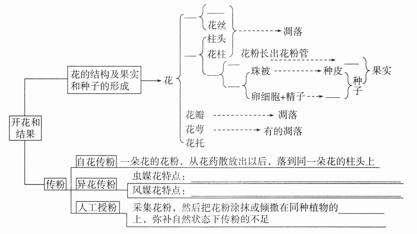 雄蕊;雌蕊;子房;胚珠;受精卵;具有鲜艳的颜色、芳香的气味和甜美的花蜜;花粉多而轻,柱头常有分叉和黏液;柱头