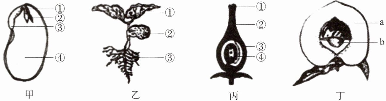 解析:豆浆中的营养物质主要来自大豆种子中的子叶,即图甲中的④;图乙中的①叶,是由图甲中的②胚芽发育而来的;经过传粉、受精后,图丙中的③子房壁会发育成图丁中的a果皮;图丁中的b种子萌发需要有适宜的温度、适量的水和充足的空气。
