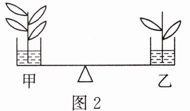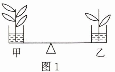 1. 如图所示,两个天平两端托盘上的盛水杯内各插有树枝,且两根树枝的树叶一多一少。开始时两个天平均保持平衡。其中图 1 放置在光照通风处,图 2 放置在阴暗通风处。一段时间后,下列说法正确的是(