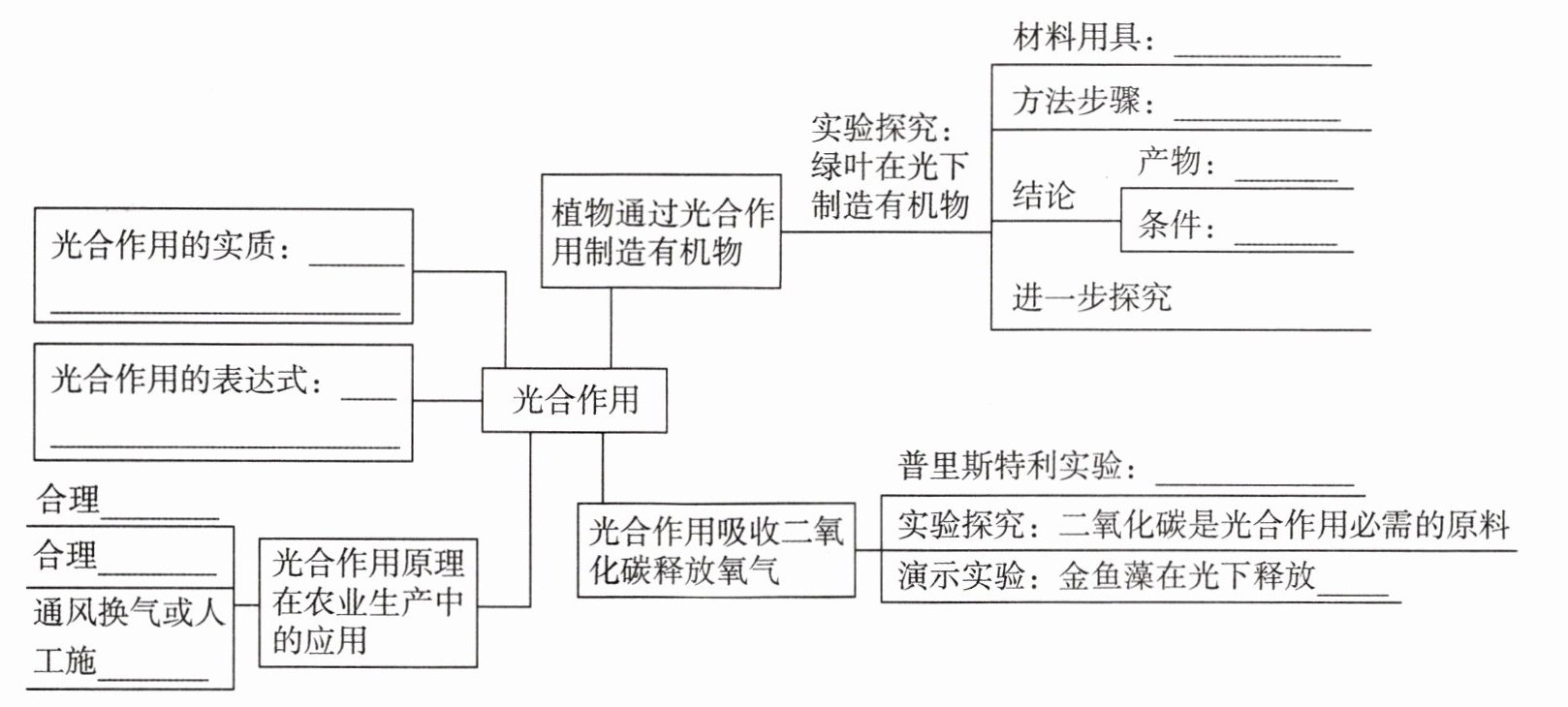 )① 光合作用产生了淀粉 ② 光是植物进行光合作用的条件之一 ③ 光合作用产生了氧气 ④ 二氧化碳是光合作用的原料