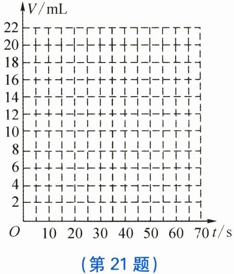 21. 为提醒人们节约用水,及时修好漏水的水龙头,小王同学做了水龙头漏水实验,用于接水的量筒最大容量为 $ 100\mathrm{mL} $。小王同学在做水龙头漏水实验时,每隔 $ 10\mathrm{s} $ 观察量筒中水的体积,记录的数据如下表: