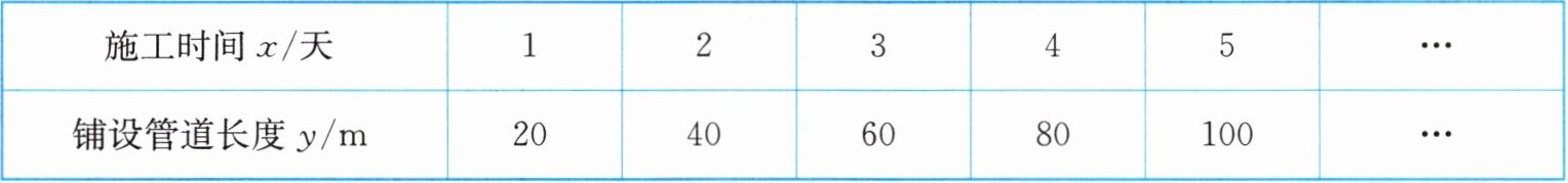 2. 某村要铺设一条全长为 $ 1000 $ m 的“雨污分流”管道,每天铺设管道的速度不变。现在工程队铺设管道长度 $ y $ m 与施工时间 $ x $ 天之间的函数关系如下表: